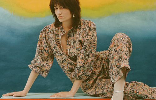 'Cosmic Blouse & Trouser Coordinate' is an easy-going two piece set. A mandarin collar blouse is cut to a relaxed fit and has three-quarter length voluminous balloon sleeves with elasticated cuffs. It has a concealed button placket, with a decorative vintage button at the inner collar. Trousers feature a drawstring and are elasticated at the waist. Tuck the blouse in to create a jumpsuit look or leave the blouse out for a cool casual attitude. They also look great when worn separately.