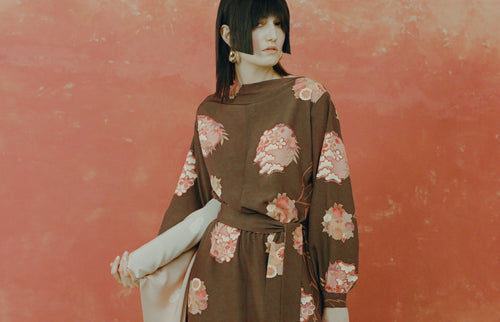 'Diva Boat Neck Maxi Dress' is a sumptuous floor-length dress with a slash neck opening. It has an elasticated gathered waist and comes with a self-belt. Long balloon sleeves evoke old-time glamour, and wide cuffs with button hole openings are decorated with vintage buttons from our archive.